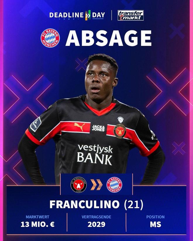 第二个目标是丹麦超球队中日德兰的弗兰库利诺,这名21岁的几内亚比绍球员出自本菲卡青训,身高186㎝,惯用左脚。本赛季22场比赛交出15球3助的成绩单,德转身价1300万欧元,拜仁曾在夏窗求购过他,遭到中日德兰拒绝。弗兰库利诺没有五大联赛经验,对米兰来说签约风险比较大。